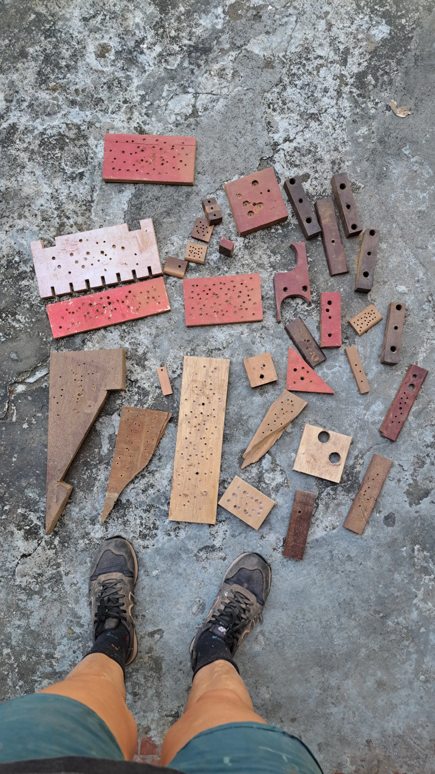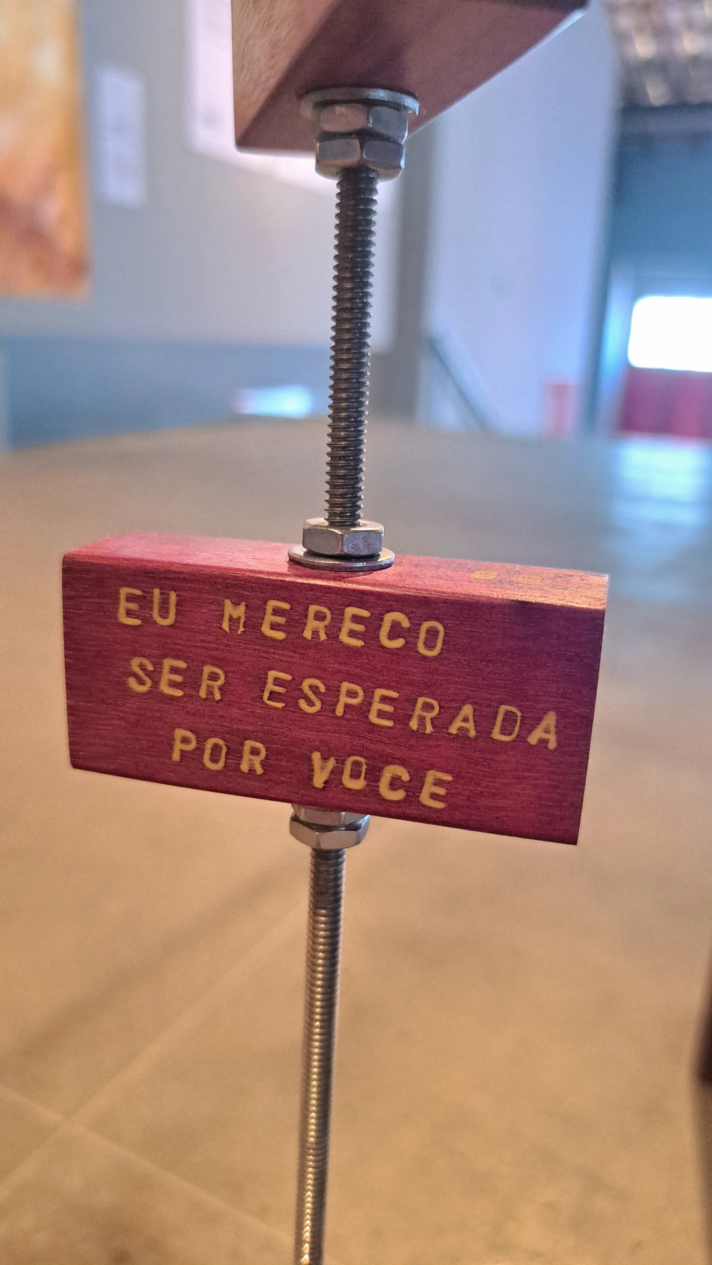 Sempre em diálogo com o território, em 2020 ela cria a Timbó atelier – um espaço de criação dedicado a peças e objetos produzidos a partir da madeira de reuso e demolição. Ao estudar a madeira em suas relações com o tempo, a memória e as estéticas populares, suas criações são mais do que objetos utilitários, tornam-se elementos de afeto. Tamboretes, bancos, esculturas e outros artefatos nascem como extensão de uma herança familiar e das vivências transmitidas por esse material que por si só carrega e guarda seu próprio tempo. É desse encontro entre madeira e memória que surgem os seus “objetos de companhia” — formas que dão voz poética a esse elemento preservando a sabedoria que ele carrega e guarda consigo, o tempo.